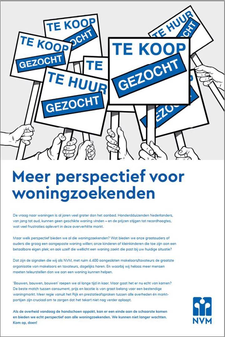 Dat zijn de signalen die wij als NVM, met ruim 4.400 aangesloten makelaars/taxateurs de grootste organisatie van makelaars en taxateurs, dagelijks horen. En waarbij wij helaas meer mensen moeten teleurstellen dan we aan een woning kunnen helpen.