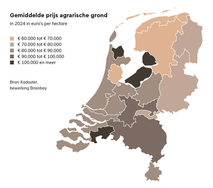 In 2024 is in Nederland voor het eerst gemiddeld meer dan € 80.000 betaald voor een hectare agrarische grond. Tien jaar eerder lag dit nog rond € 50 duizend per hectare. Ten opzichte van heel 2023 steeg de grondprijs in het afgelopen halfjaar met 3,3 procent naar € 81.500 per hectare. Door blijvende grondhonger zetten de prijsstijgingen onverminderd door, voorzien NVM-makelaars Agrarisch & Landelijk.